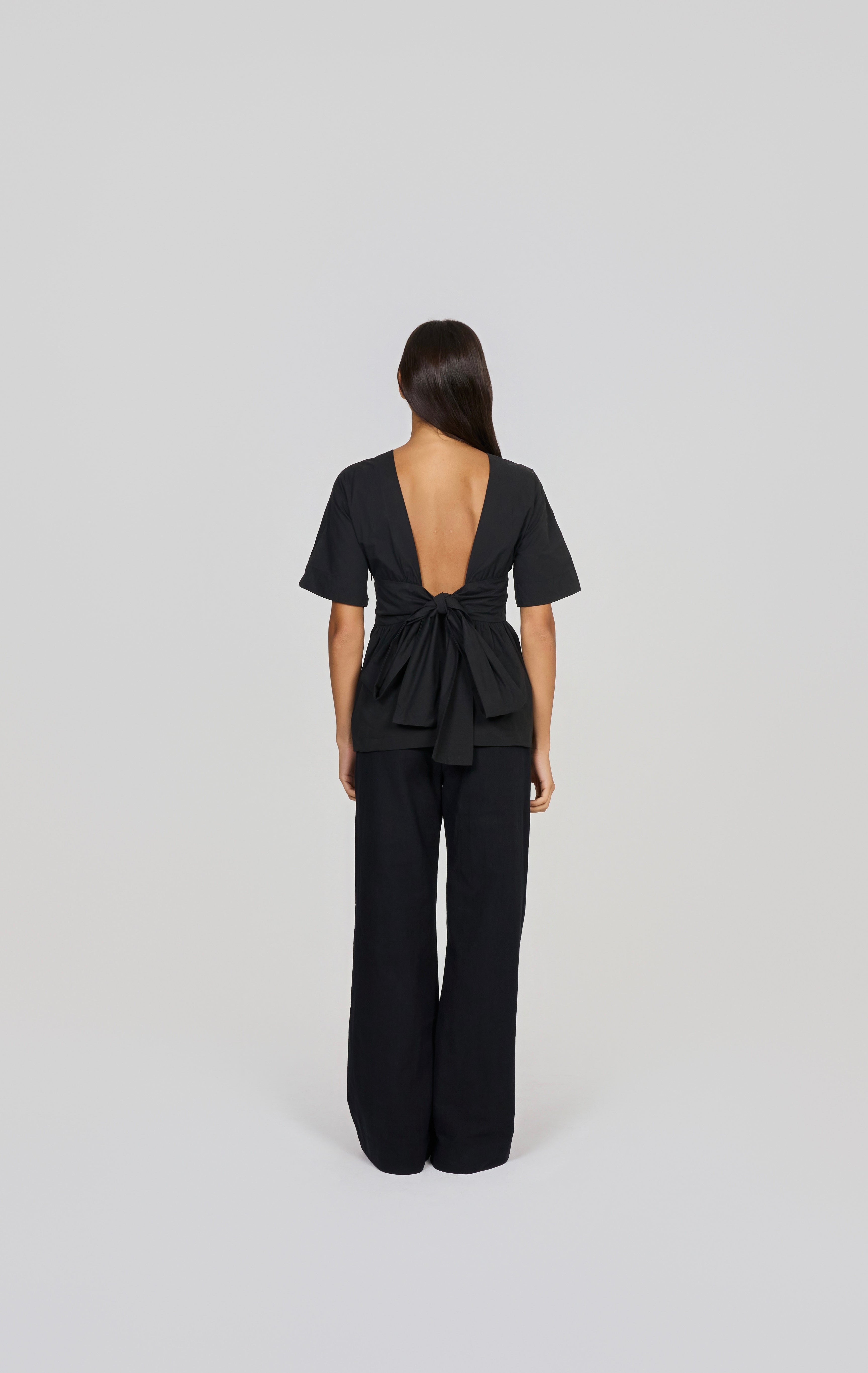 The Short Sleeve Rhoe Top is a piece made from 100% cotton. It has an open back, tied with a beautiful bow.