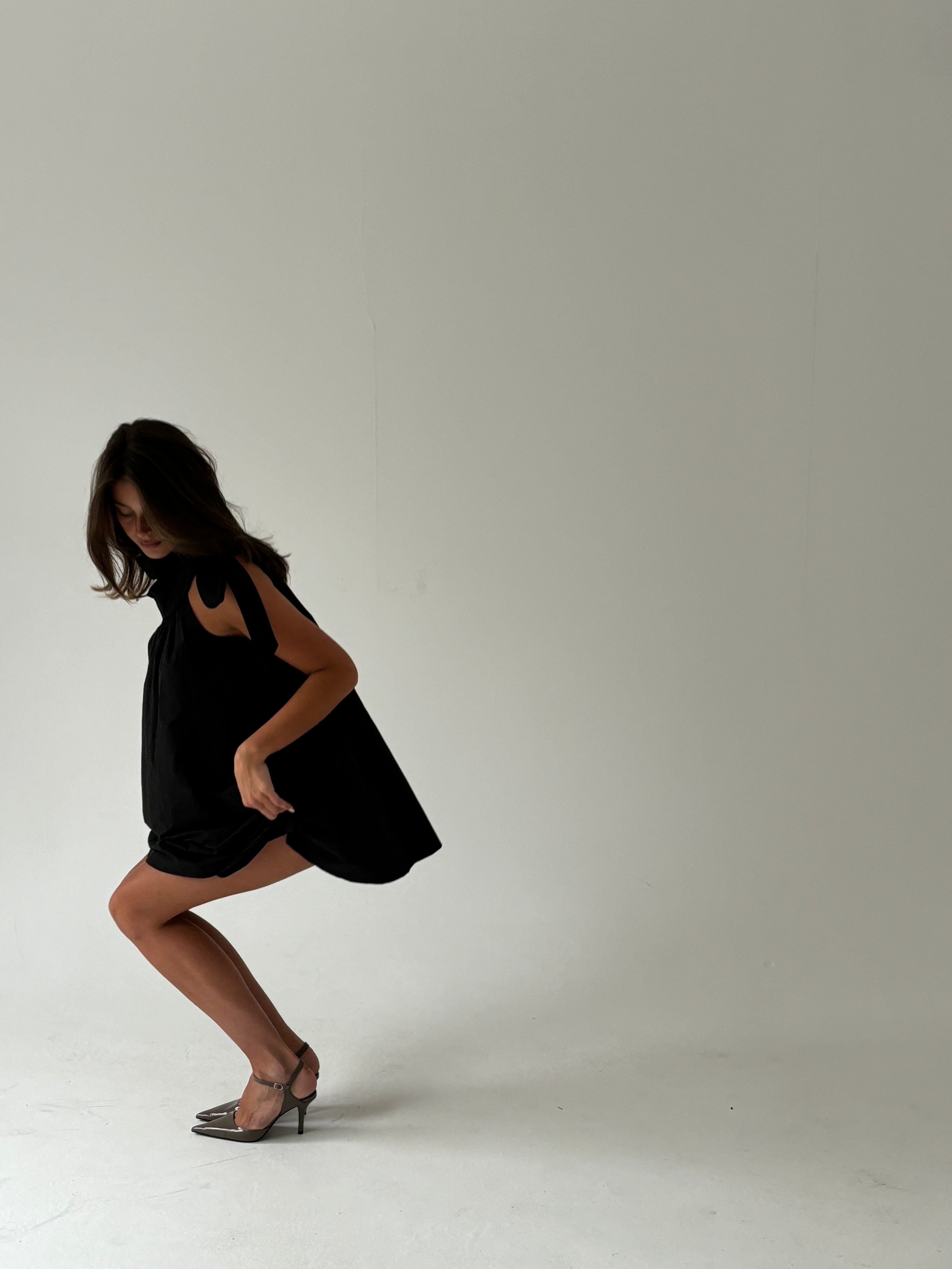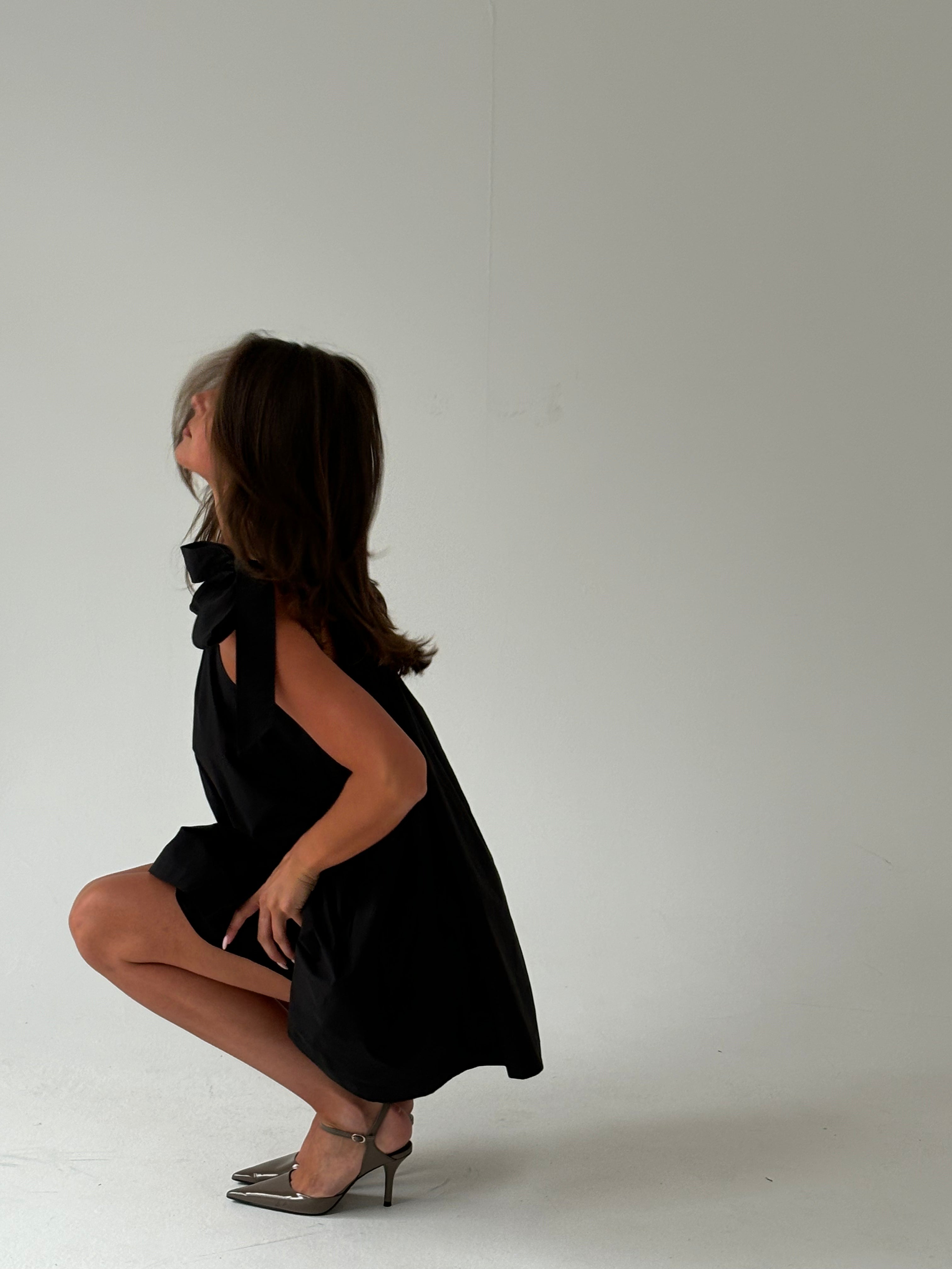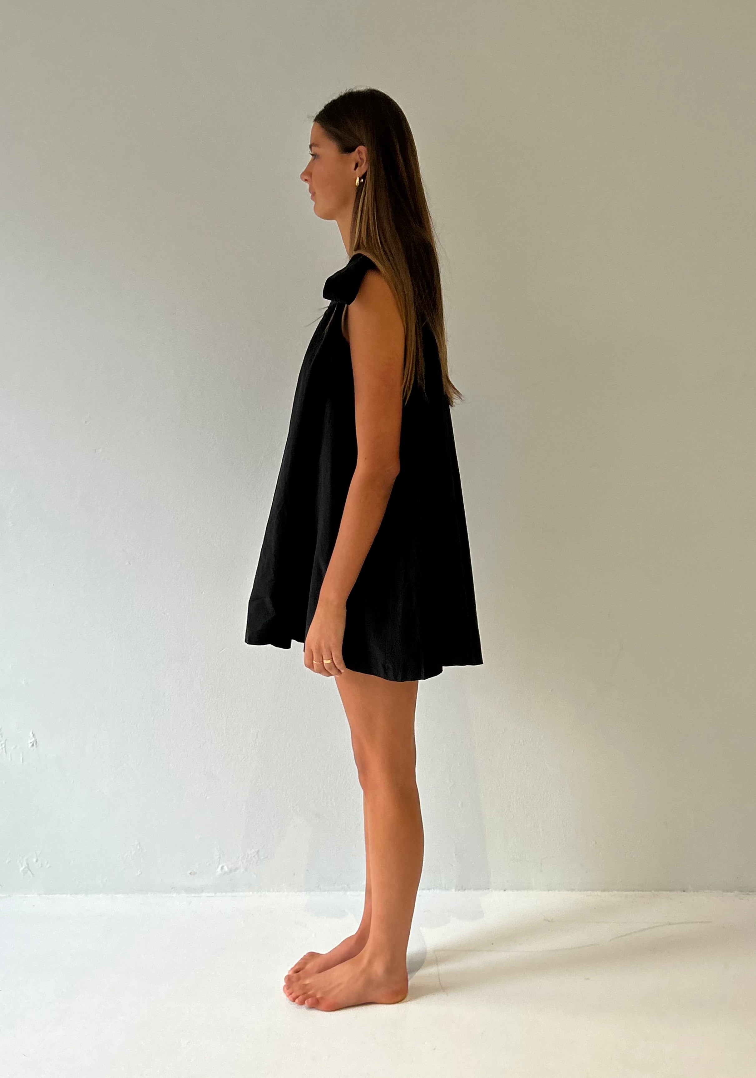 The Brownlow Bow Mini Dress in Black. One shoulder tied mini dress that is made form a lightweight, thick and luxurious 100% cotton.  This product also has pockets.